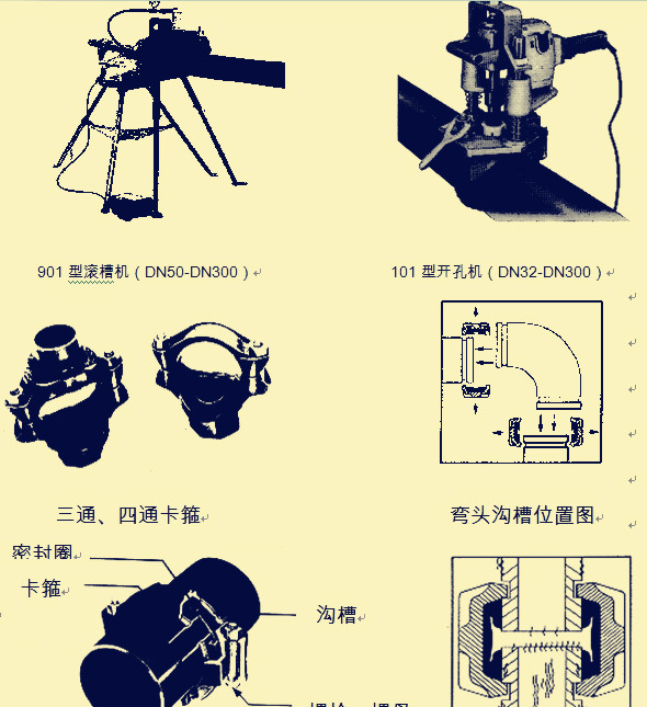 (7)消防管道的干、支管安装前,绘制预制草图,根据设计图纸的要求,向班组作详细的技术交底,确保干管上所开的三通、四通位置准确,便于卡箍连接的平直和严密;卡箍安装采用专用滚槽机和开孔机,见下图。